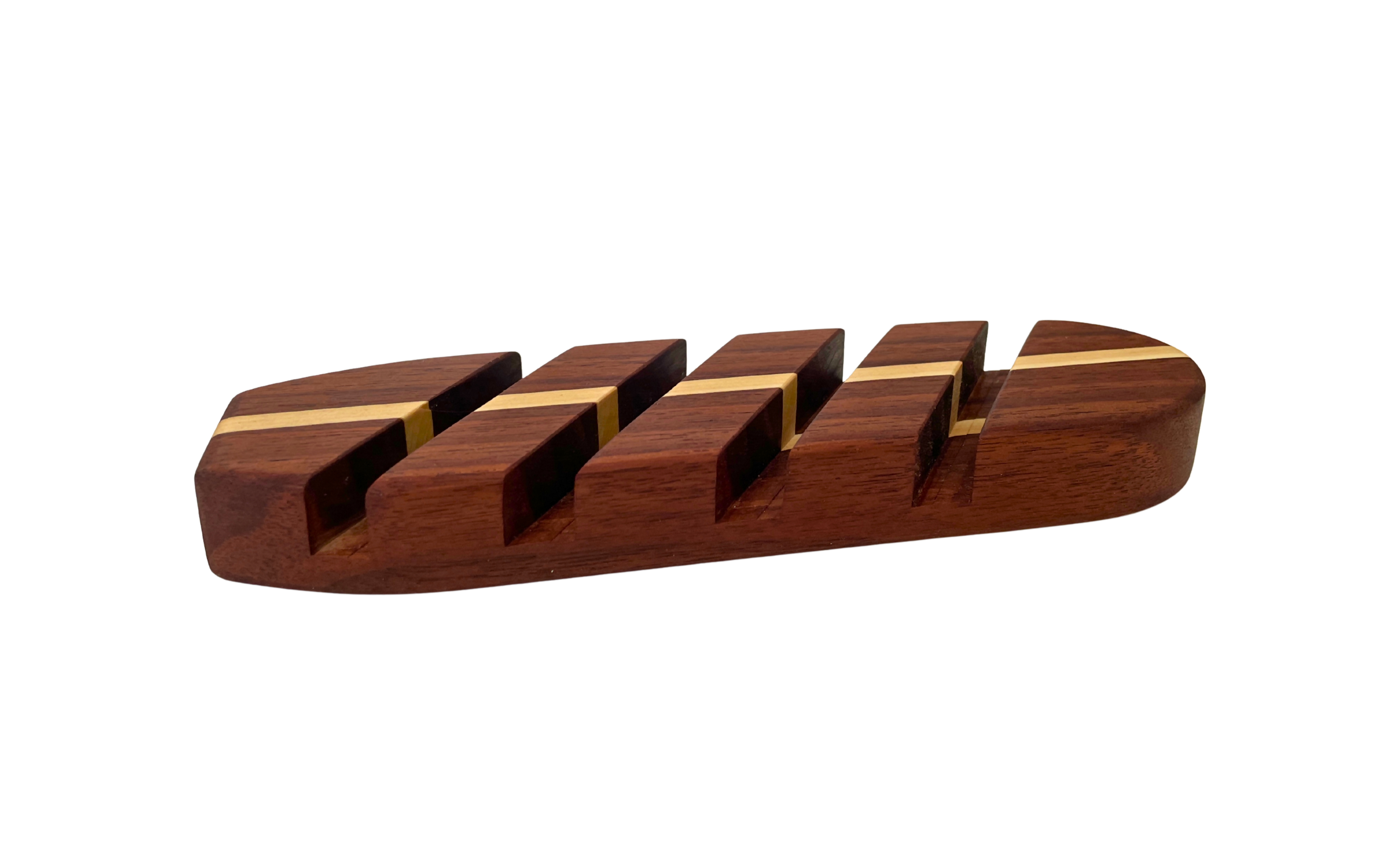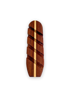Handmade walnut & cedar surfboard fin display shaped like a longboard. Has slots for 4 fins. Approx. 8" x 2". Wood is finished with premium hardwax oil for low lustre shine. Cedar "stringer" is an offcut from Grain Surfboards.