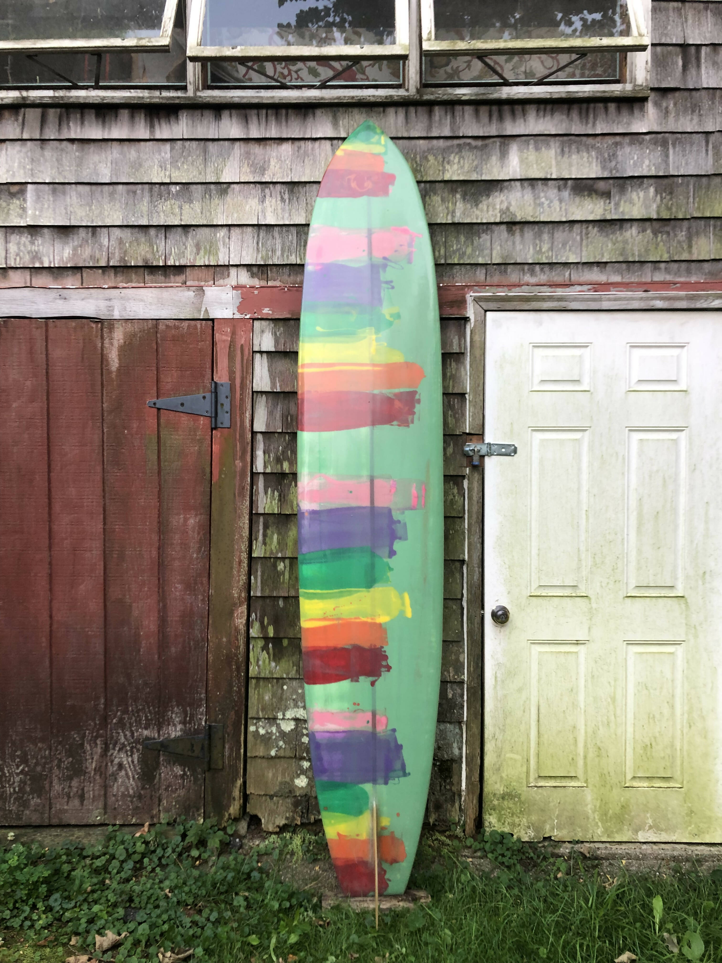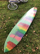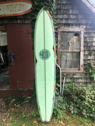 Glassed on handmade fin, 1/2 inch redwood stringer. Narrow and thin for a longer board but good for the slightly bigger days. Thicker in the middle and thinner towards the rails. Only ridden a few times.